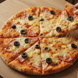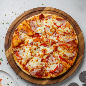 Салями, ветчина, томат, перец, сыр, соус, яйцо, маслины