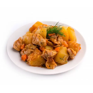 Картофель, филе птицы, грибы, соус, перец, зелень