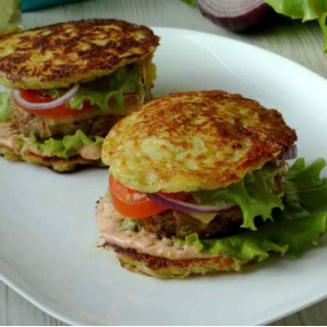 Булочка XXL, куриная котлета, маринованный огурчик, помидор, салат айсберг, сыр, драник, фирменный соус, лук фри