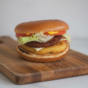 Булочка XXL, куриная котлета, помидор, сыр, фирменный соус, луковые кольца